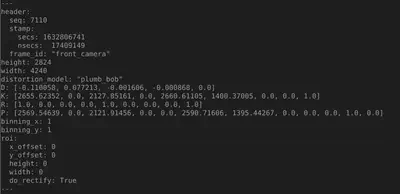 Camera intrinsic matrices can be found in ROS topic ‘/front_camera/camera_info’, which are available in all bag files. The detail is as following:
