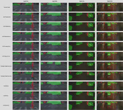 The dataset used for validate the network is the Waymo open dataset. The video above visualizes the segmentation results based on different illumination and weather conditions. The following is the qualitative comparison results of the CLFT against other models.