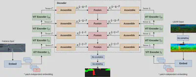 This project proposes a vision-transformer-based network to carry out camera-LiDAR fusion for semantic segmentation applied to autonomous driving. The proposal uses the novel progressive-assemble strategy of vision transformers on a double-direction network and then integrates the results in a cross-fusion strategy over the transformer decoder layers. So far when this page was created, this is the first open source camera-LiDAR-fusion transformer-based network that invokes the camera-plane-projection strategy to process the liDAR point clouds data during the fusion.
