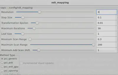 For [Method Type], choose the [pcl_generic] if the autoware.ai was compiled without CUDA enabled. There is no doubt that [pcl_anh_gpu] has advantages in speed when processing the point clouds data. However, as mentioned in previous section, even though we managed to compile the autoware.ai with CUDA enabled, when choosing [ndt_anh_gpu], ndt_mapping module was always stuck somewhere during the processing of the point clouds data. At the last, we decided to simply use the [pcl_generic] to process the data by CPU.