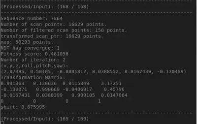 when mapping the heavy point clouds, there is a possibility that the numbers of ‘(Processed/Input)’ (as shown in the picture bellow) are different from each other too much. The first number represents the frame that is being processing, the last number means the total frames that have been loaded. If the difference of these two numbers are too big, it is recommended to pause the playing of the bag for a while until they are closing to each other. It is also possible to play the bag at a slow rate if the point clouds data in it is heavy. An substituted solution for heavy point clouds data is using [approximate_ndt_mapping], which is similar as the [ndt_mapping] except saving PCD as multiple sub-map files. The interval of each sub-map file can be defined as parameter (in meter unit).