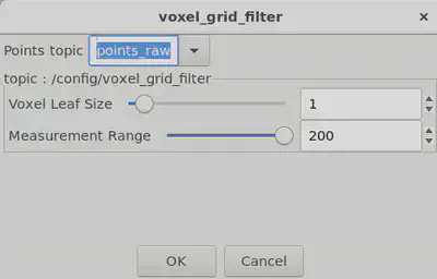 The voxel grid filter is point clouds downsampling method which approximates (downsamples) all points in each voxel (3D box) with their centroid. Here we set the [Voxel Leaf Size] to 1, which means all points in the 1m-size-3D-box will be approximated to one point.