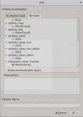 Close the window for parameters turning, the initiate the ‘waypoint_saver’ module. Go to Rviz to add the corresponding topic.