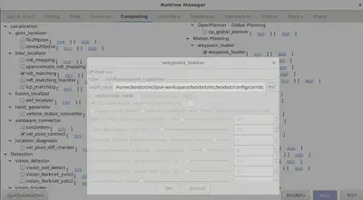 Starting moving the vehcile along the desired path. When vehicle arrives the destination, uncheck the box in front of the ‘waypoint_saver’. All waypoints will be saved as a CSV file in pre-defined path. Here is the waypoints we recored for the boxbot demo.