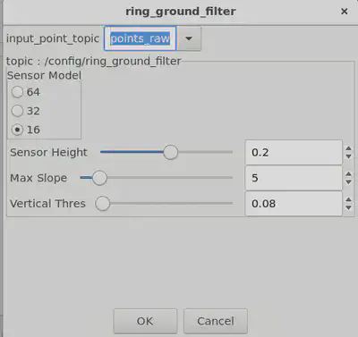 Please note that ‘ring_filter’ module requires the point clouds topic has a field named ‘ring’, otherwise errors will occur. For Velodyne LiDAR sensors, ‘ring’ value means the amount of laser beams that were used to produce the corresponding point. The ‘ring’ value is the main criteria for ‘ring_ground_filter’ module to filter the ground points out. Be careful that some other LiDAR sensor models might not provide this information, then other algorithms will be needed here to do the ground filtering.