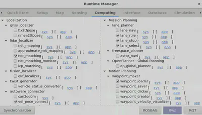 Please note that it is has to start playing the bag a little bit then pause it. This is critical because when the runtime manager was initiated, the ROS parameter ‘/use_sim_time’ will be set as true. Then the mapping and localization modules will subscribe a topic called ‘/clock’ to use the simulation time. This topic will only be published when the bag file being played. If initiating the mapping module without the ‘/clock’ topic published, there will be some tf related issues.