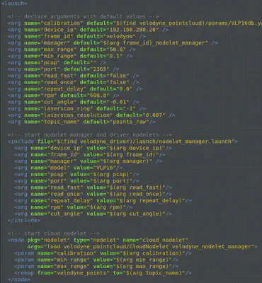 As for the configurations of the LiDAR’s ROS driver. The important change we made that compared with the default setting is the ‘max_range’. Because the environment is the corridor of the building, the original value 130 of the ‘max_range’ will make the map contains the points which are too far away. Smaller numbers such as 5 or 10 will cause mapping module unable to orients the points properly. At the last, we chose the 50 for the ‘max_range’. Here is our launch file of Velodyne LiDAR’s ROS driver.
